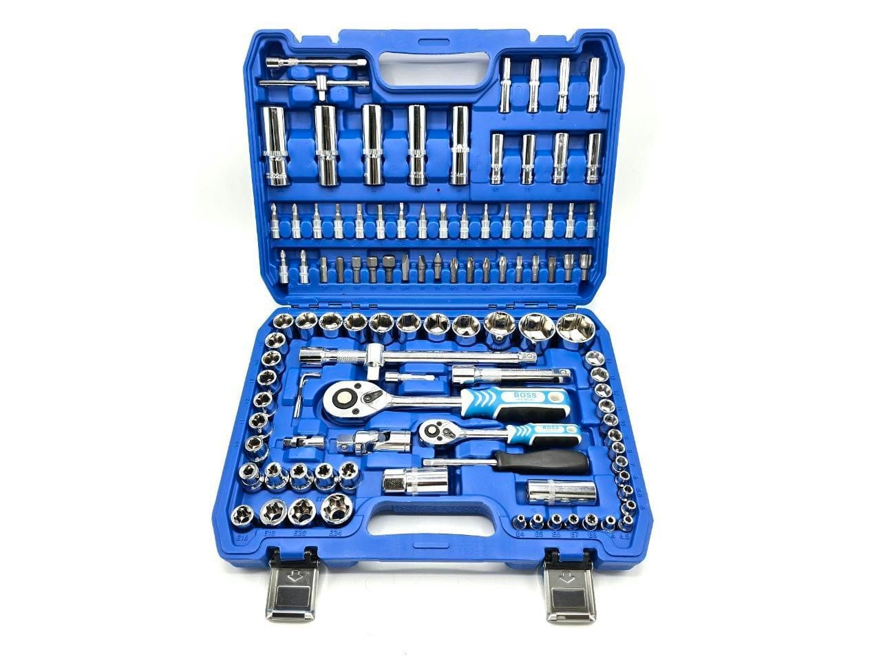 18 عدد بکس 1/2، 13 عدد بکس 1/4، 13 عدد بکس E، دو عدد جغجغه ضامندار (بزرگ و کوچک)، دو عدد کمک بکس (12.5 و 25 سانتیمتر)، کمک بکس کوچک 10 سانتیمتر، دسته بکس کشویی بزرگ و کوچک، رابط بکس تاشو 1/2 و 1/4، دو عدد بکس شمع (21 و 16 میلیمتر)، دسته پیچگوشتی 1/4، آچار آلن (سایزهای 1.5، 2 و 2.5)، بکس 1/2 پایه بلند (سایزهای 14، 15، 17، 19)، بکس 1/4 پایه بلند (6 تا 13 میلیمتر)، 35 عدد نوک پیچگوشتی صنعتی، تبدیل بکس به نوک پیچگوشتی |