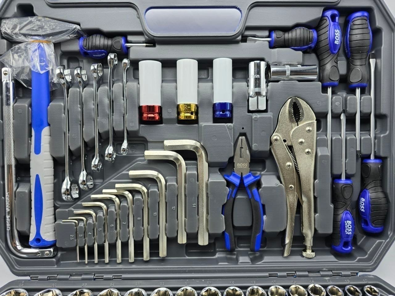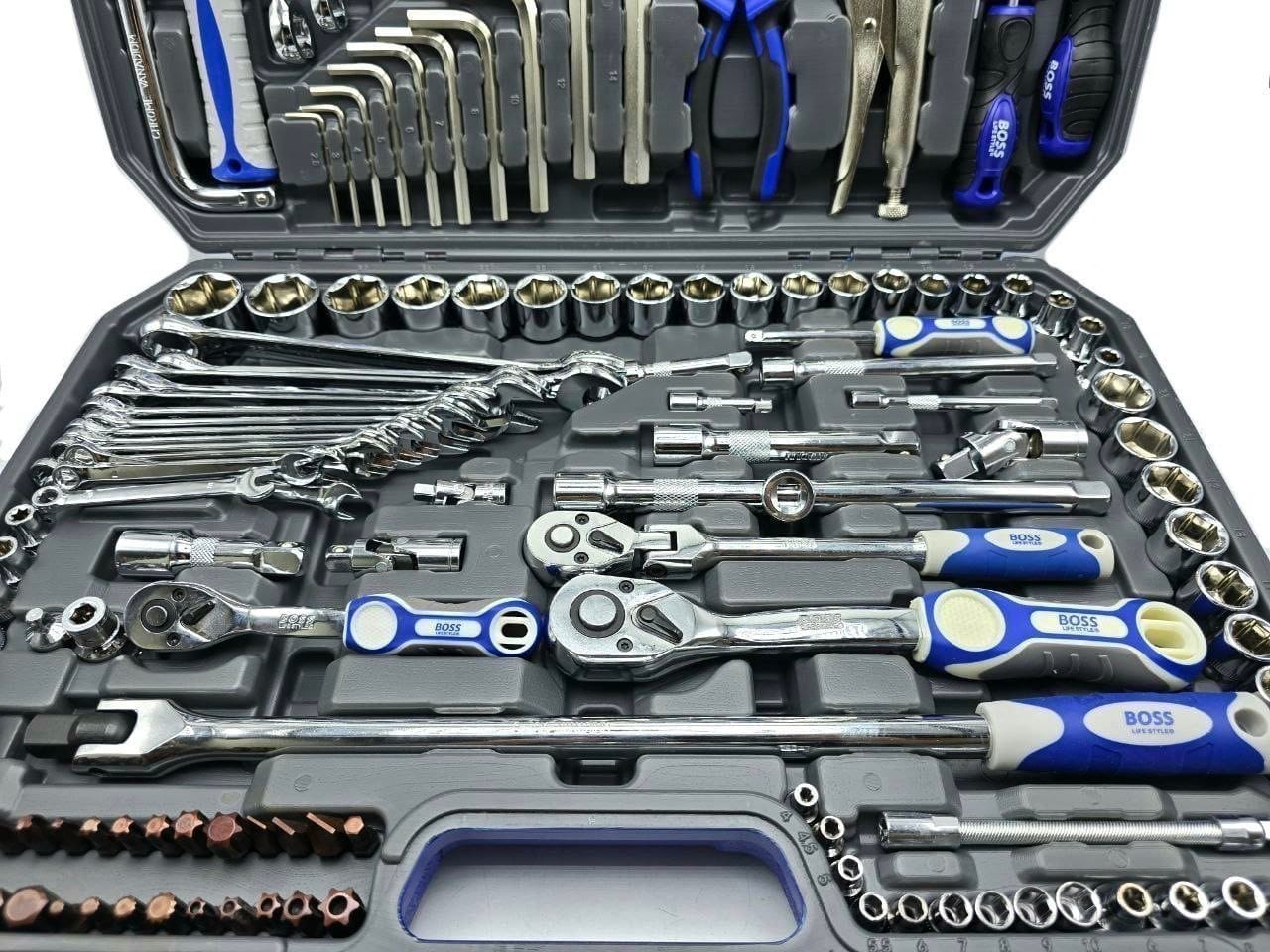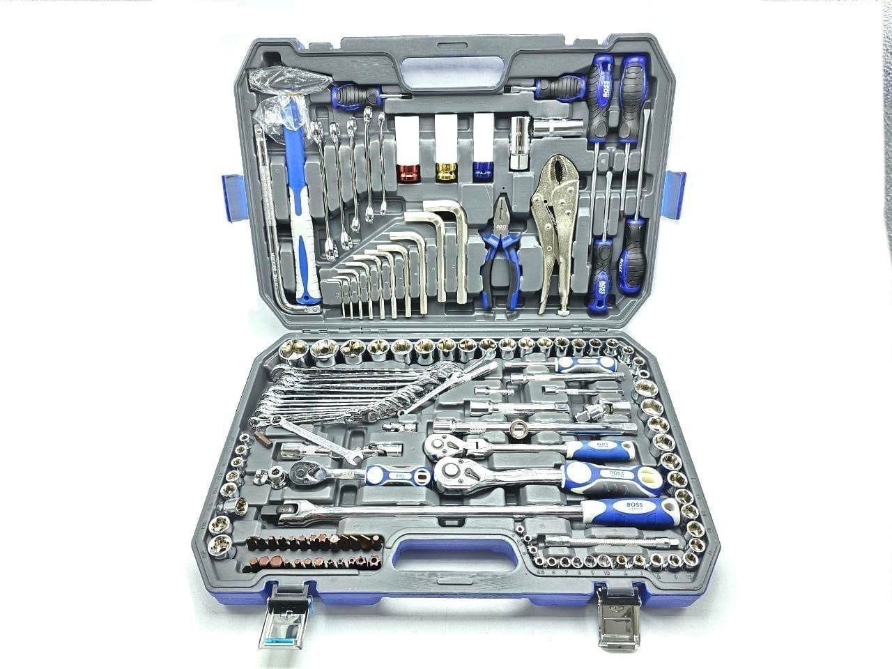 6 عدد پیچ گوشتی دستی، انبردست، انبرقفلی، چکش فایبر، 10 عدد آچار آلن (سایز 2 تا 14)، 17 عدد آچار یکسر رینگ (6 تا 24)، 5 عدد آچار دو سر تخت (8 تا 19)، 19 عدد بکس 1/2 (8 تا 32)، 15 عدد بکس 3/8 (6 تا 22)، 9 عدد بکس 1/4 (4 تا 10)، 10 عدد بکس E (4 تا 20)، 5 عدد بکس شمع، 1 عدد دسته بکس 1/2 سر تاشو، 26 عدد نوک پیچ گوشتی، سه سایز جغجغه، 6 عدد کمک بکس، دسته بکس کشویی بزرگ و کوچک، رابط بکس تاشو (1/2 و 1/4 و 3/8)، دسته پیچ گوشتی 1/4 |