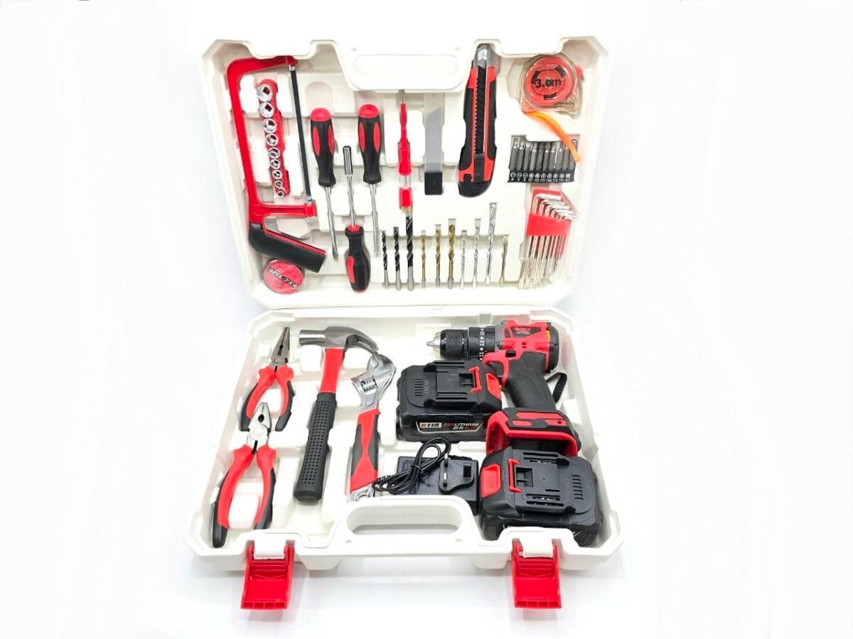 آچار فرانسه سایز 8، انبردست، دمباریک، چکش، بکس تک سایز 4 تا 13، متر 3 متری، پیچ گوشتی دوسو و چهارسو سایز بزرگ، پیچ گوشتی نوک خور، مته آهن سایز 5، 6 و 8، مته دیوار سایز 5، 6 و 8، تبدیل نوک پیچ گوشتی به بکس، چسب برق، کاتر، فازمتر دیجیتال، آچار سه نظام، 5 عدد تیغ کاتر، دو سایز پیچ، کمان اره چوب و فلز |